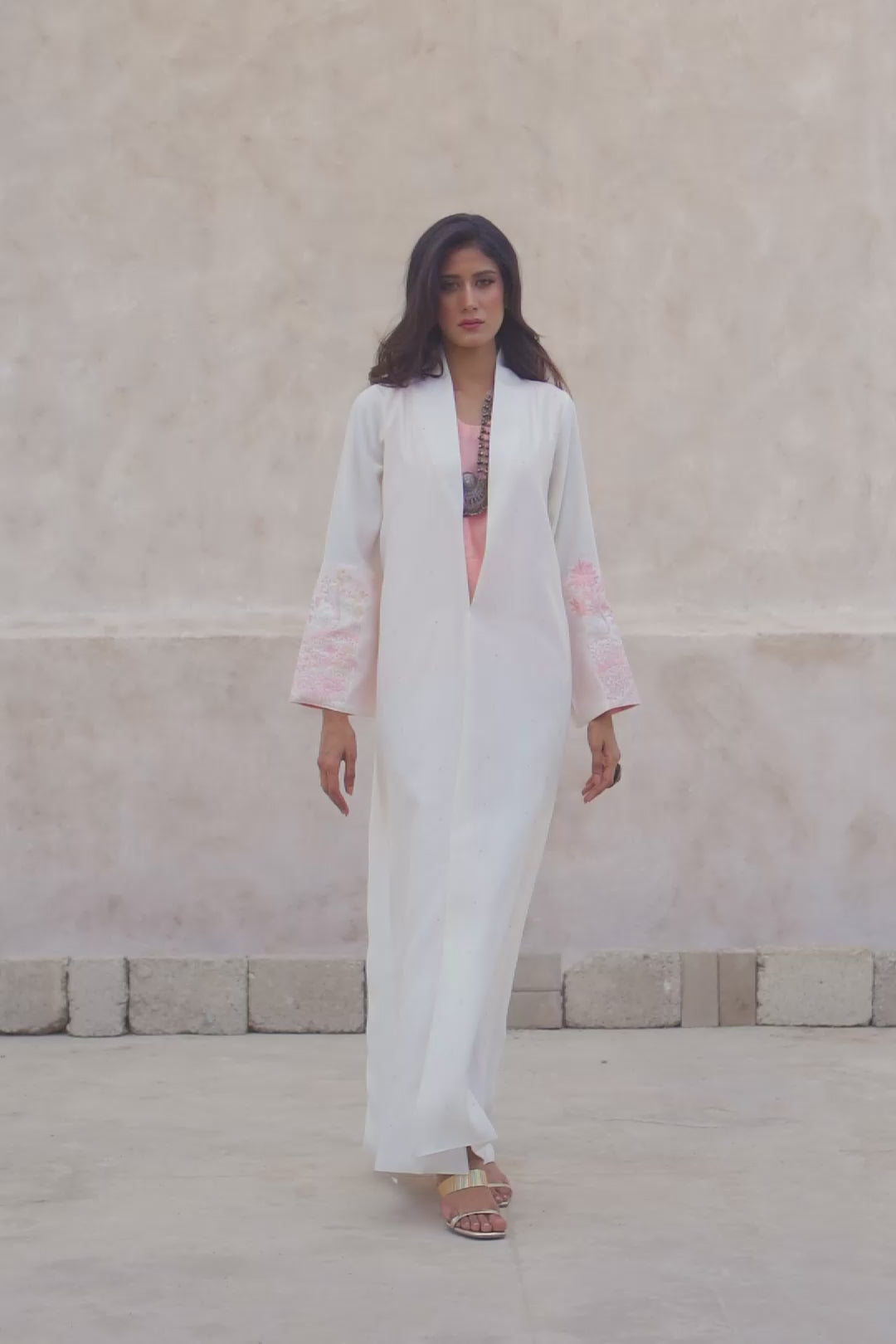 An elegant ivory khaddi floor-length jacket, intricately adorned with Shaikargah resham embroidery on the sleeves and back, rendered in delicate shades of peach and pink. Subtle sequin accents are layered within the embroidery, adding a refined touch of understated glamour.