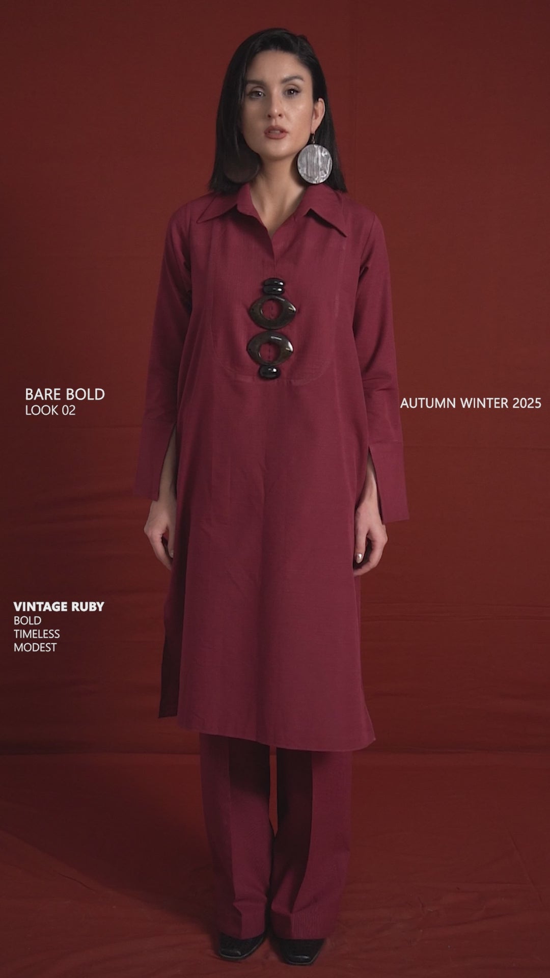 The vintage ruby colour pure khaddar set featuring an A-line shirt and matching pants in the same fabric and tone. The silhouette is elevated with a bold statement neckline, Side pockets add practicality making it perfect for those who prefer timeless simplicity with a touch of confidence basic yet bold, effortless yet refined.